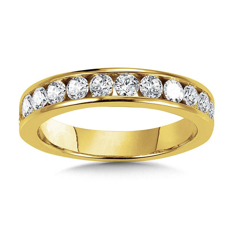 Featuring 13-stones, this channel band protects its diamonds from scratching while reflecting their sparkle, amplifying the entire ring’s shine. This piece would make a perfect wedding band, anniversary band, or alternative engagement ring.