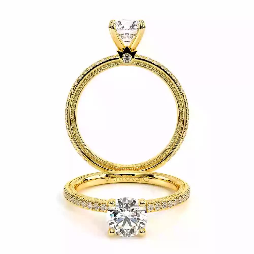 A flawless and refined look on a classic silhouette-TR120-R4 is forged under extreme pressure and pushes the limits of craftsmanship. This ring features our hand sculpted Signature Verragio beading and impeccable diamond setting on the band to perfectly highlight your choice of center stone.